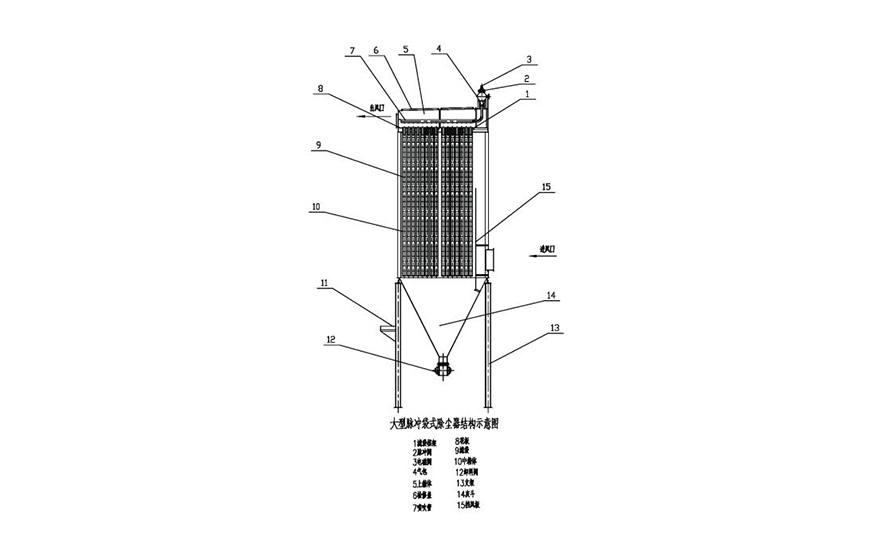CD長(zhǎng)袋脈沖袋式除塵器的主體結(jié)構(gòu)由上箱體、中箱體、袋室、灰斗、卸灰裝置、噴吹裝置、和控制儀幾大部分組成。并配有基礎(chǔ)支柱、爬梯、欄桿、檢修門等等,并可根據(jù)用戶要求選配先進(jìn)的設(shè)備運(yùn)行監(jiān)測(cè)系統(tǒng)。