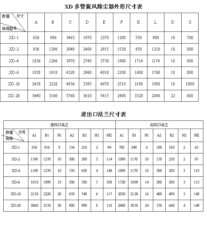 二、XD型多管高效旋風(fēng)除塵器技術(shù)數(shù)據(jù)表: