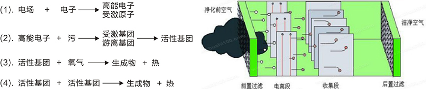 從以上反應(yīng)過(guò)程可以看出,電子先從電場(chǎng)獲得能量,通過(guò)激發(fā)或電離將能量轉(zhuǎn)移到污染物分子中去,那些獲得能量的污染物分子被激發(fā),同時(shí)有部分分子被電離,從而成為活性基團(tuán)。然后這些活性基團(tuán)與氧氣、活性基團(tuán)與活性基團(tuán)之間相互碰撞后生成穩(wěn)定產(chǎn)物和熱。